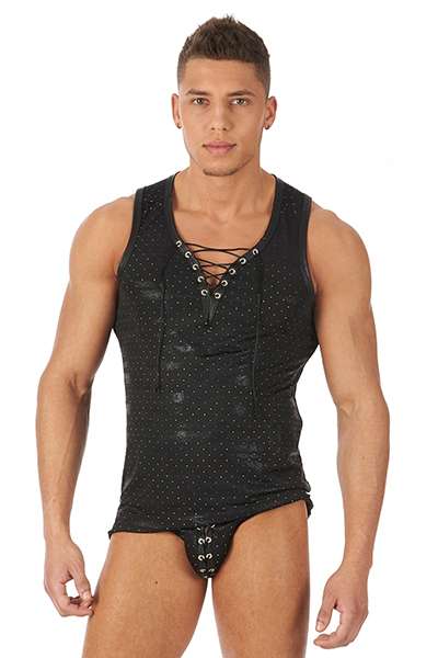 The brand new Bandit collection tank top by Gregg Homme is made from a soft, leather-look fabric that’s adorned with rugged-looking micro studs and features an adjustable lace-up neck with 5 metal eyelets on each side, a banded neckline and arm holes and the Gregg Homme metal logo tag centred at the back of the neck. The new briefs in the Bandit collection have an adjustable lace-up front with 6 metal eyelets on each side, a low-rise elastic waistband, centre-seamed seat, folded leg hems and the Gregg Homme metal logo tag at the rear.